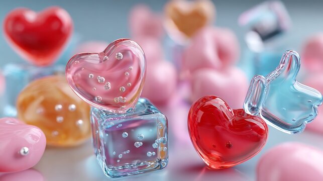 A vibrant 3D illustration of numerous red social media notification icons, each displaying a white heart and a count of '1', floating against a soft red gradient background.