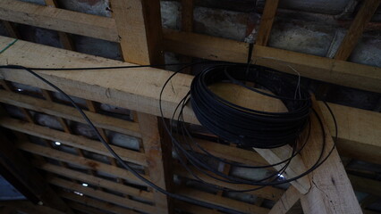 Internet cable coiled, tied, and hanging under the wooden house roof.
