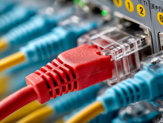 Red ethernet cable plugged into network switch port surrounded by multiple blue cables indicating high-speed data connection and network communication setup
