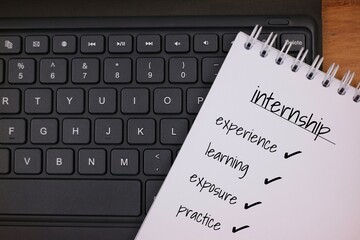 Notepad with Checklist on Internship Benefits Over Computer Keyboard Background
