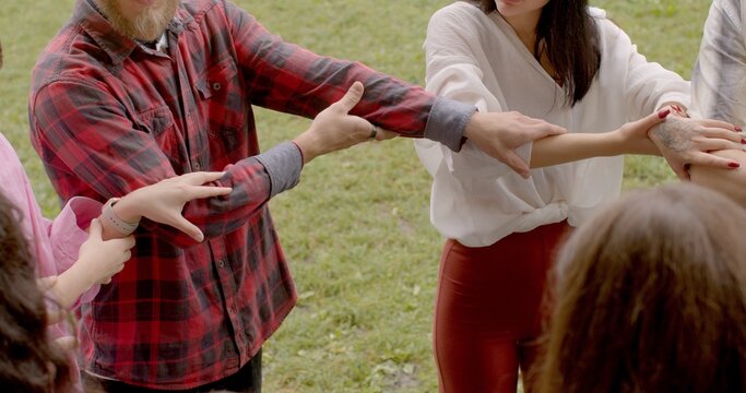 Holding hands in group setting promotes sense of connection trust among participants. Creates physical bond symbolizes support unity within group. Somatic body-oriented therapy involves participants.