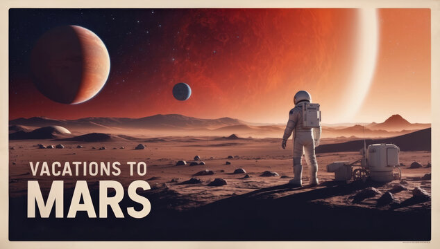 creative representation of space travel leisure activities with humans venturing onto the red planet's surface