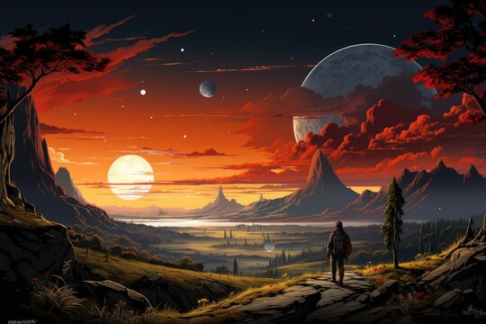 Astronaut traversing towering grasslands during golden sunset, suggesting interplanetary exploration and otherworldly landscape with dramatic lighting and mysterious atmosphere