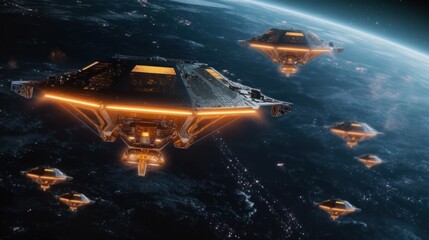 Futuristic cylindrical spacecraft cruising low orbit with shuttle thruster trails