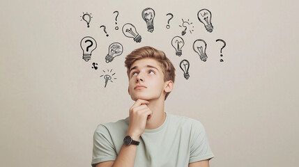 Thoughtful young man and drawn question marks on a grey background with space for text