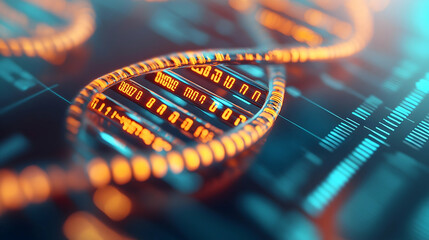 A vibrant visualization of a DNA double helix intertwined with digital data, symbolizing the intersection of genetics and technology.