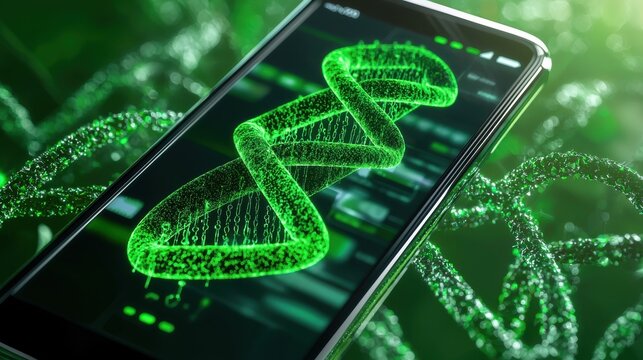 A smartphone displays a glowing green DNA helix, symbolizing the intersection of technology and genetics.