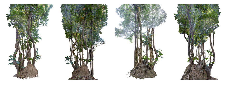 Big set The trunk of the tree was covered with twisted vines on a large termite nest on a white background there are copy areas and intersecting paths.