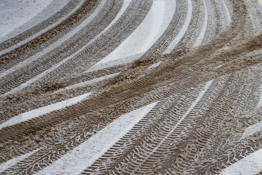 Multiple vehicle tire tracks forming intersecting patterns on a slushy and dirty snow-covered road during winter weather conditions.