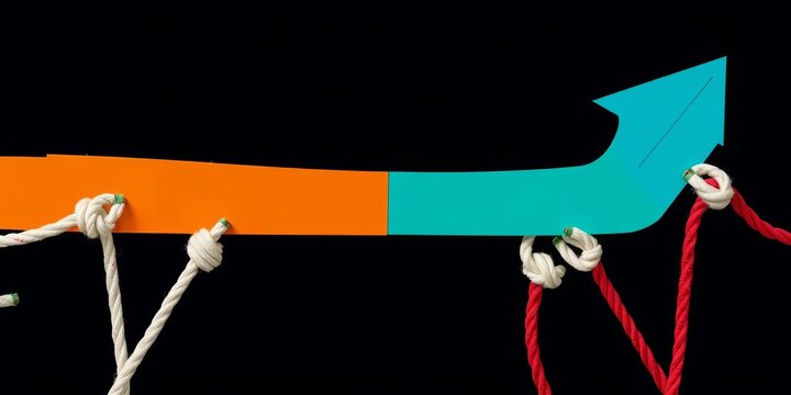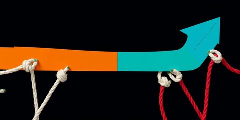 A vibrant assembly of colorful ropes intertwined to create a directional arrow, symbolizing collaboration and teamwork.