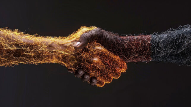 Digital Partnership: Two hands clasped in a firm handshake, intertwined with digital networks. Represents collaboration, agreement, and partnership in a modern, technological context.