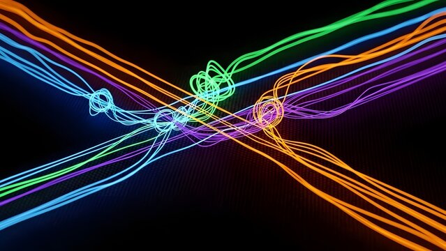 Intertwining neon lines on black background