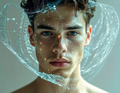 Deep gaze of a young man intertwined with an luminous digital matrix, visualizing the integration of human identity within evolving technology and future connectivity concepts
