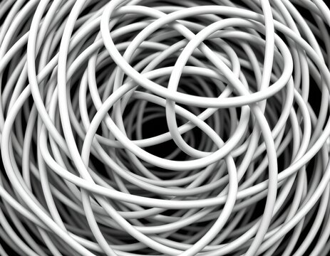 the image displays a close up of a tangled object that appears to be a coiled piece of wire with numerous loops, creating a plex structure, the wire is densely packed