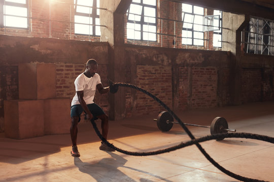 Athlete swinging battle ropes in bright industrial gym during intense functional training