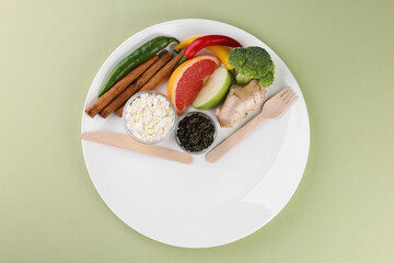 Metabolism. Plate with different food products and wooden cutlery on pale green background, top view
