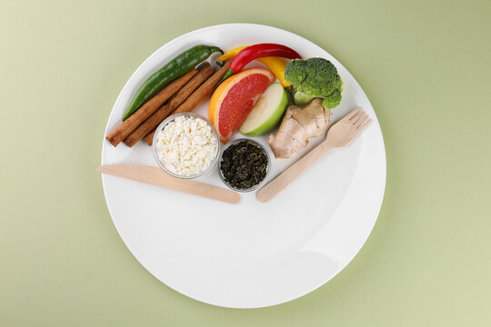 Clock on plate symbolizes interval fasting and mindful eating practices. Generative AI
