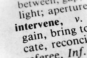 Man holding signs with the words 'intervene' and 'look away'. Symbol for the inner conflict in a dangerous situation to intervene and not look away.