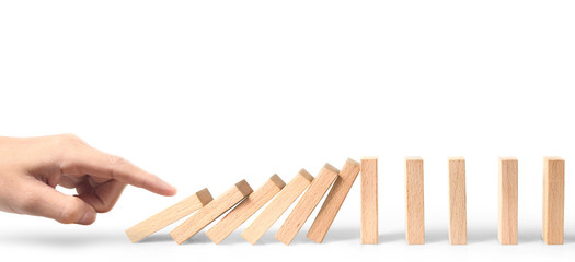 Businessman halting the domino effect inserting his hand between falling and upright wooden blocks