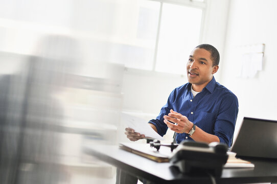 Black businessman talking at office desk