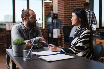 Asian manager interviewing worker recruiter recruiting for hr job discussing business offer in startup office. Businesswoman hiring candidate after checking cv resume. Recruitment concept