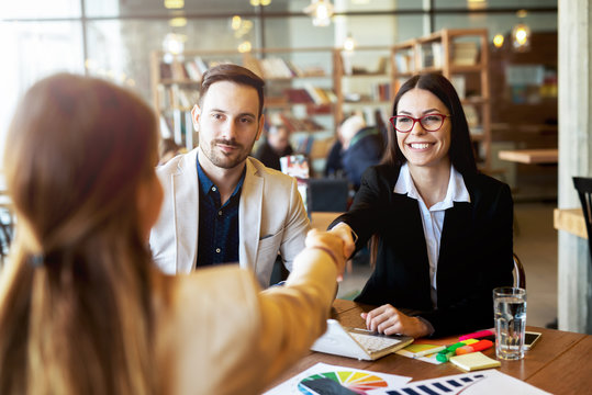 Young indian businessman ceo hr director having interview hiring for job with female African American attorney sitting in office at panoramic view window. Shot through jalousie glass.