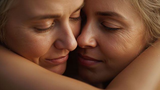 Two women sharing tender close embrace portrait conveying intimacy and gentle connection