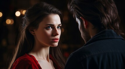 A close-up of a young woman engaged in an intense, intimate conversation with a man in a dimly lit setting, suggesting a serious or romantic exchange.