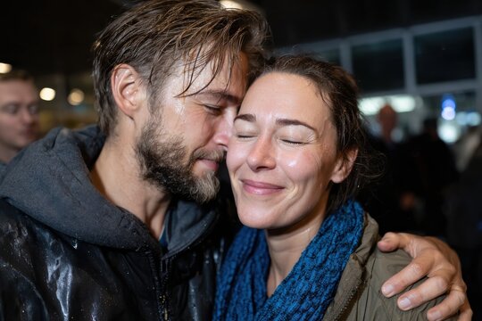 Young couple smiling closeup with warm bokeh string lights romantic cafe intimate portrait