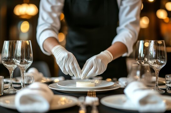 Elegant Dining Setup: A sophisticated dining table is set with stylish tableware and golden cutlery, bathed in the warm glow of soft candlelight, promising an evening of culinary delight.