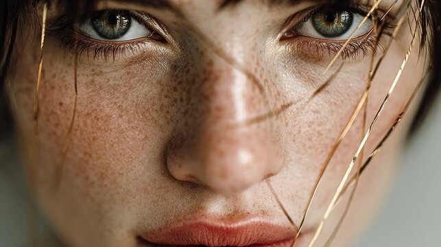 Close-Up Portrait of Young Woman with Intense Eyes and Freckles, Capturing Emotions and Natural Beauty in a Soft Natural Light