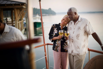 Mature adult woman resting her head on the shoulder of her husband while holding wine glasses on a deck.