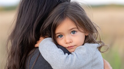 Tender moment: little girl with downcast gaze embracing her mother
