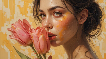 pink tulips beige background yellow oil thin strokes orange extremely expressive face leading color holding intimately historic