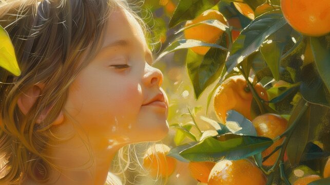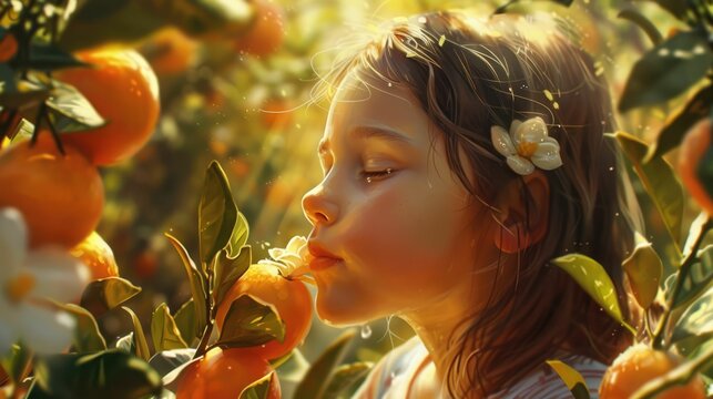 A young girl intimately engaging with the scent of a fresh citrus fruit in a sunlit grove. A young girl inhales the fresh scent of an orange amidst the warm glow of a citrus grove at sunset. AIG50