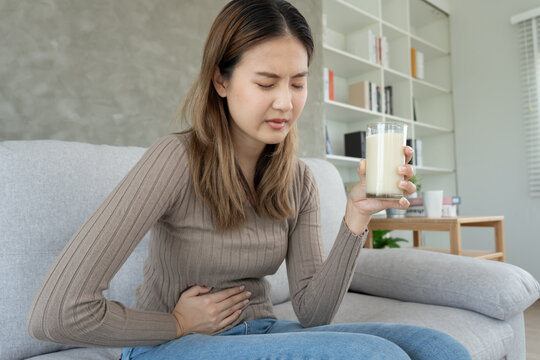 lactose intolerance concept. Woman holding a glass of milk and having a stomachache.