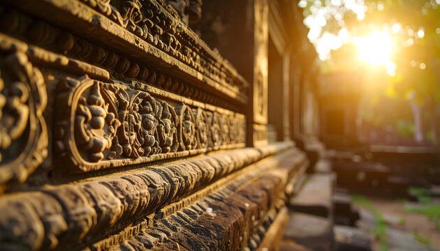 Intricate Stone Carvings on Ancient Temple Wall at Sunset
