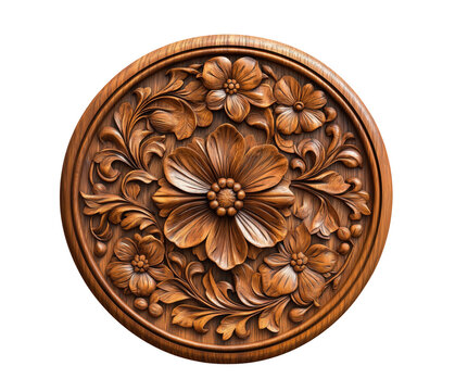 Exquisite wooden carving featuring floral motifs and intricate botanical design on white backdrop