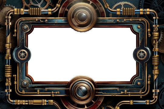 Intricately ornamented rectangular frame in steampunk style set against a pristine white background, adorned with gears, clockwork elements, rivets, and dials.