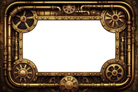 Steampunk frame with intricate details. Bolts, gears, screws, pipes. Made of steel, copper, brass and other Victorian retro vintage material. Industrial Engineering. Transparent PNG background.