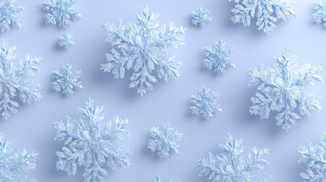 White snowflakes on a plain white or blue background, highlighting their unique symmetrical patterns. SEAMLESS PATTERN. SEAMLESS WALLPAPER.