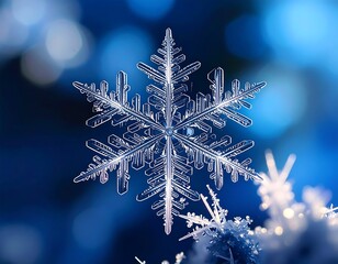 Beautiful macro of snowflake crystal in winter. Cold blue background of frozen snow and ice. intricate, delicate pattern creates sense of serene natural wonder