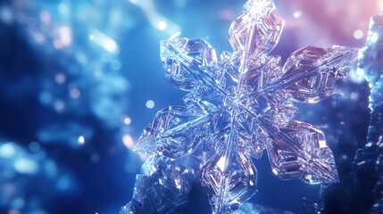 Detailed macro photograph of sparkling snowflakes on a blue background, capturing the intricate and delicate beauty of winter.