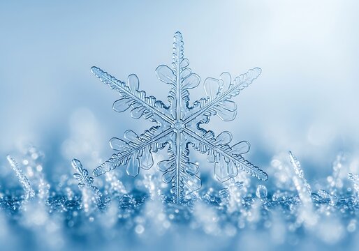 A stunning close-up of a delicate, intricate snowflake standing on sparkling ice, against a soft blue background. Ideal for winter, holiday, and nature themes.
