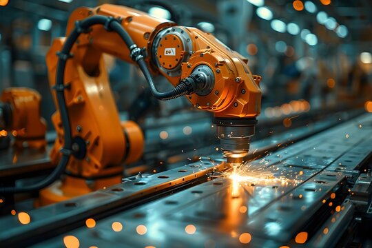 A robotic arm with intricate mechanical joints is engaged in a precision task on a metallic surface.