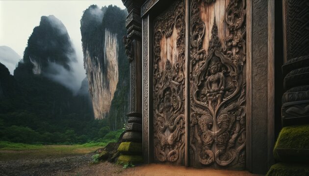 A close-up of a traditional wooden gate with intricate carvings, set against the backdrop of towering limestone cliffs.