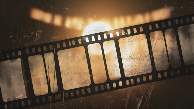 Vintage Filmstrip Over Sun: A nostalgic filmstrip with a grainy texture, capturing the essence of vintage cinema. The filmstrip frames a bright sun, creating a warm and inviting atmosphere. Perfect fo