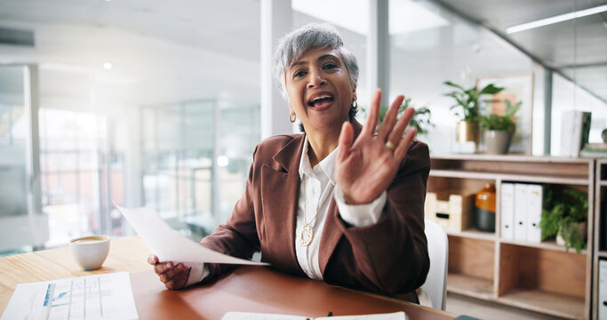Mature, happy woman or portrait with wave, documents or greeting in office for finance advice. Female person, accountant or financial advisor in POV for video call, introduction or pitch in workplace