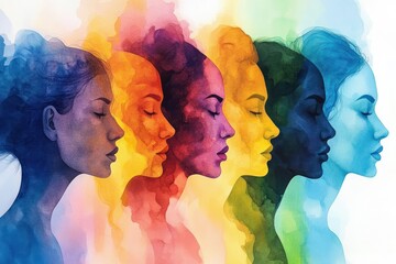 layered watercolor silhouette profiles in rainbow hues flowing across canvas, evoking introspection and creative emotion