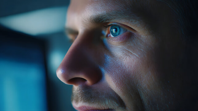 Focused Vision: A close-up shot captures the intense gaze of a man, his eyes reflecting concentration and determination, set against a backdrop of subtle, cool-toned lighting.